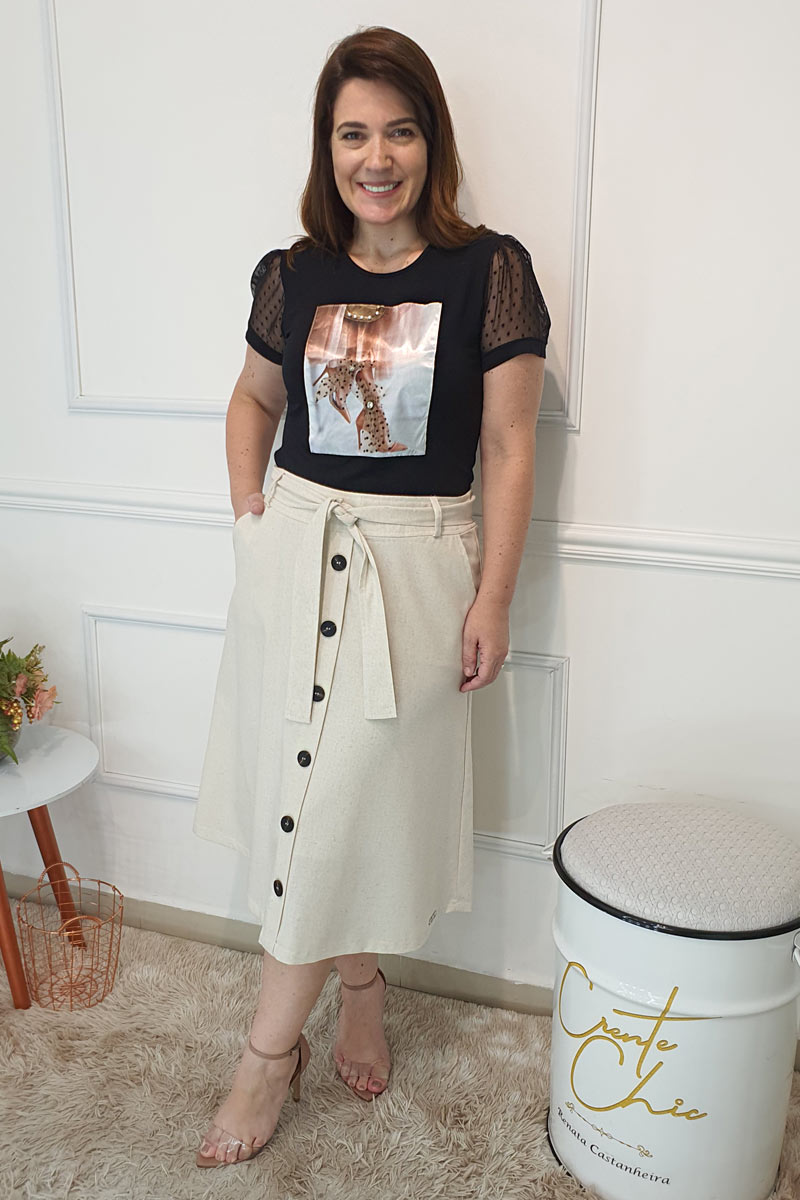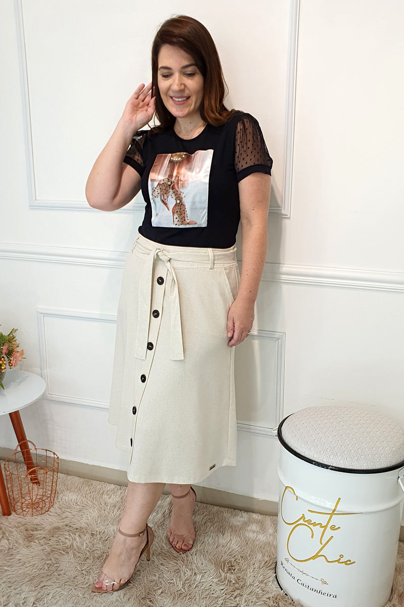 9119 Saia Social Midi Evasê Tecido: LinhoComposição: 46% Viscose, 24% Poliéster, 20% Linho e 10..